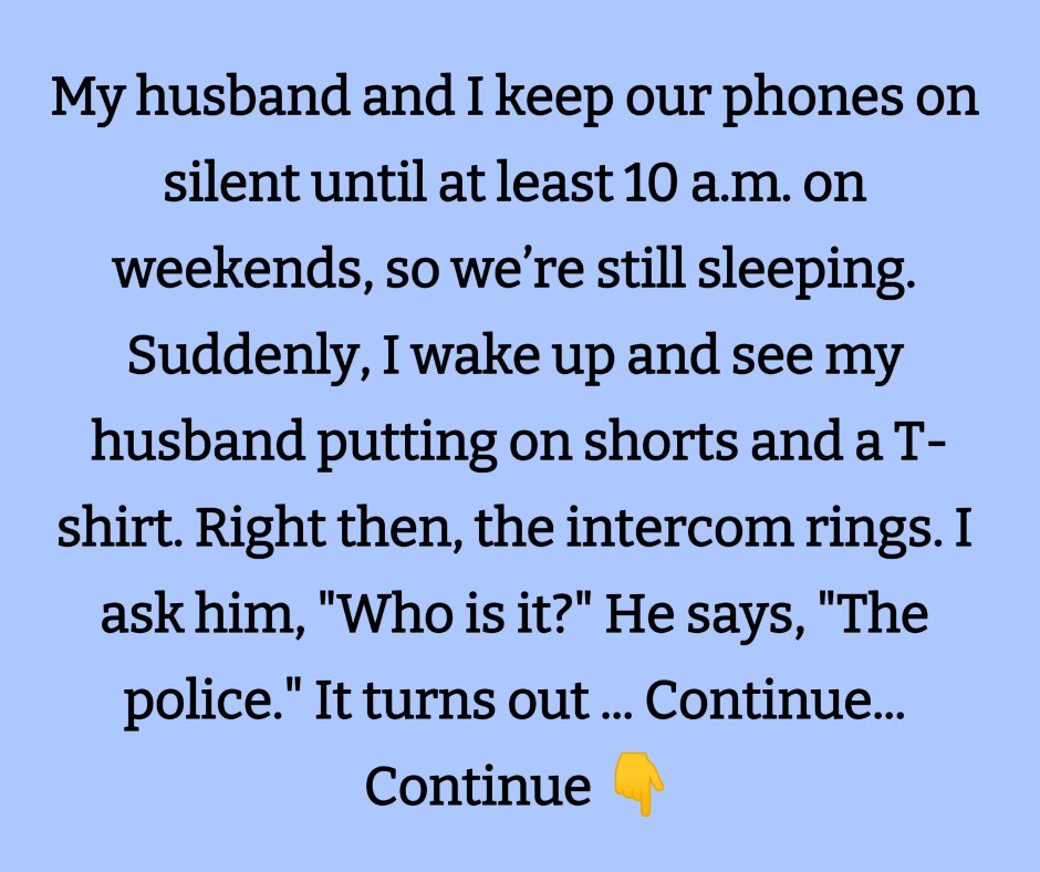My husband and I have our phones on silent until at least 10 a.m. on weekends. So, we’re sleeping. Suddenly, I wake up to the sound of my husband pulling on shorts and a T-shirt. Immediately, the intercom rings. I ask him, “Who is it?” He replies, “Police.”