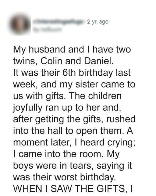 With great excitement, Colin and Daniel tore through the wrapping paper, expecting magical treasures. They bellowed enthusiastic thank-yous as they reached inside the boxes. The scene took a sharp turn when the gifts transformed into art—performance art of heartbreak.