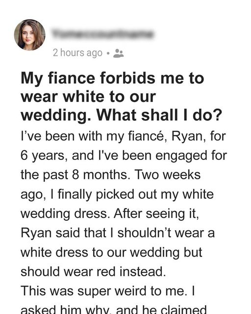About a month ago, in October, Ryan surprised OP with an unexpected request. He mentioned that he had been discussing wedding plans with some of his coworkers and suggested that she should not wear a white dress.
