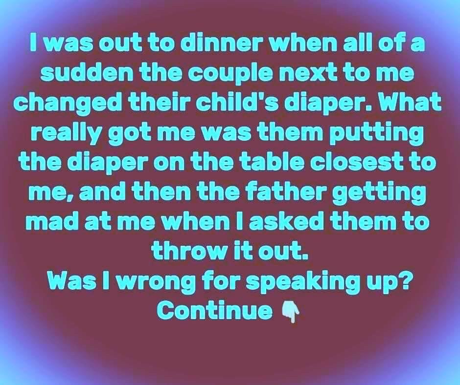 He explained that while out to eat at a restaurant “above an applebees, but not a fancy restaurant,” with his girlfriend he witnessed a couple change their baby’s diaper at the table.While we were sitting there the couple changed their baby at the table and left the diaper sitting at the end of their table closet to us,” he wrote.