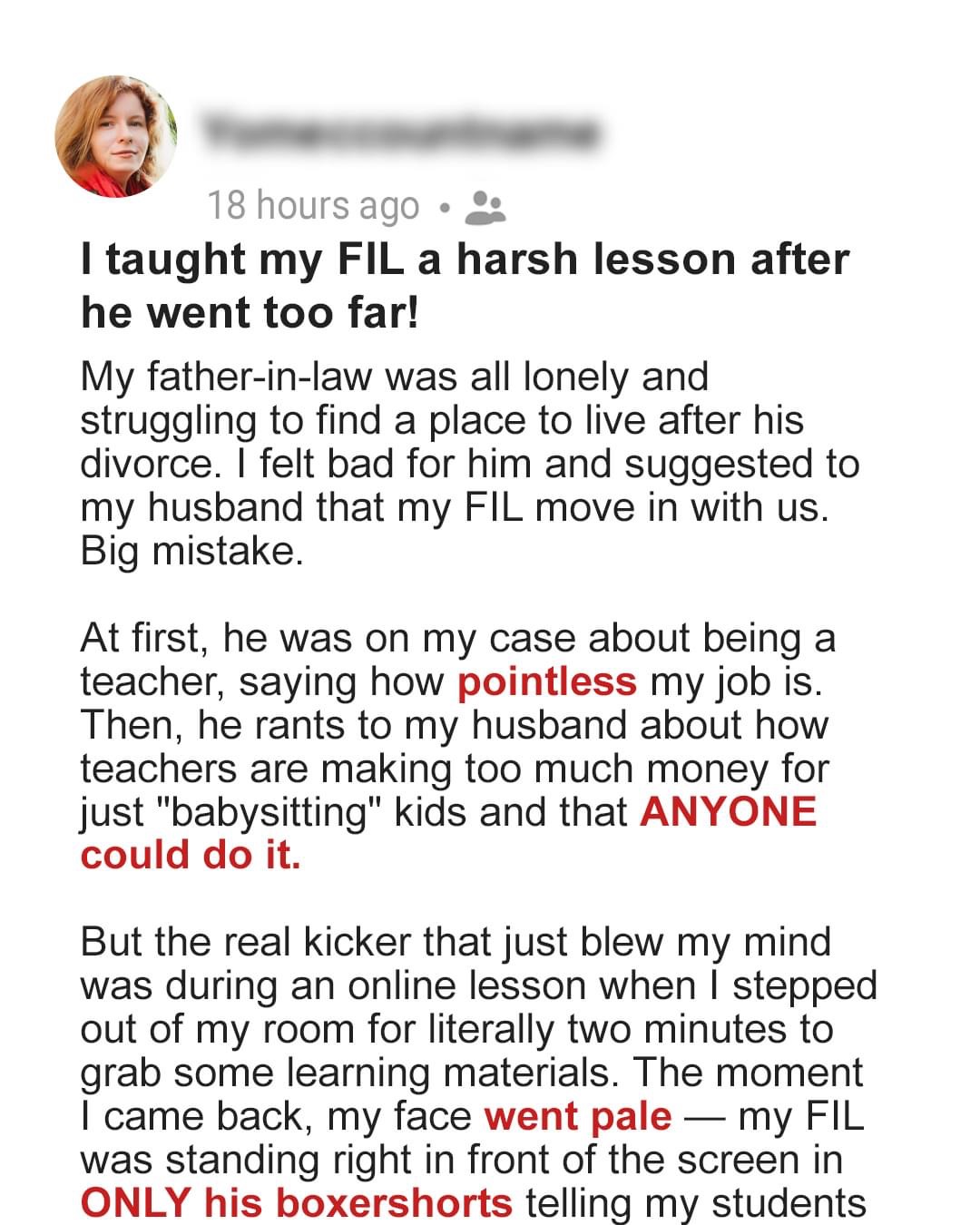 The inappropriateness of his attire and the disrespect for my professional environment infuriated me. Later, when I confronted him about the incident, emphasizing the importance of maintaining a professional image in front of my students, he scoffed dismissively and said the room was his own and that he could do as he pleased. It was clear that reasoning with him was futile lack of respect for my profession was further demonstrated when he took it upon himself to interact with my students during a brief moment when I stepped out of the room. His unwanted intervention made my students uncomfortable and undermined my authority and the respect I had worked hard to establish. Fed up, I confronted Martin, expressing that his behavior was unacceptable and that it was time for him to leave. Lena supported my decision, but the aftermath was tumultuous. She later confessed that she thought I had been a bit harsh, suggesting that Martin’s derogatory comments about my job were just bad jokes. This revelation stung, deepening the rift that Martin’s stay had created. Things became even worse when Martin shared his version of events with his sons, Lena’s brothers, who then declared we were no longer welcome in their homes. According to them, our actions proved that we did not value family. This accusation was particularly painful, as it came from people we cared about deeply and whose opinions mattered to us. Reflecting on these events, I am torn between the conviction that I did what was necessary to protect my professional integrity and the guilt of possibly overreacting to a man who was, after all, going through a difficult time in his life. The rift it caused within our family is a wound that has yet to heal fully. However, this experience has also been a profound learning opportunity. It highlighted the importance of setting clear boundaries and the need for mutual respect, regardless of familial ties. It taught me that while compromise is essential in any relationship, there are non-negotiable aspects of our lives and identities that must be defended, even at the cost of conflict. As I continue to navigate the complexities of family dynamics and professional challenges, I am reminded of the delicate balance required to maintain harmony in both realms. The saga of Martin’s stay, though fraught with tension, serves as a reminder that the values we hold dear often require us to make difficult decisions, ones that may not always be popular but are necessary for our growth and well-being. Here’s another story about a teacher who learned that her ex’s daughter was forced to do homework out in the rain.