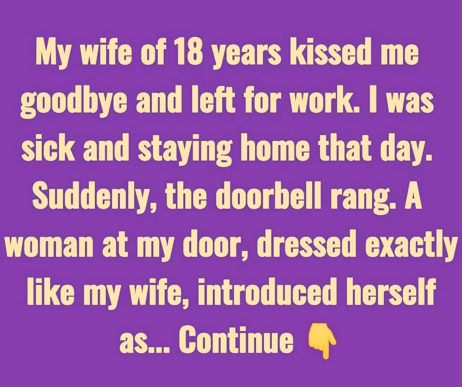 My wife of 18 years kissed me and left for work. I was sick and staying home that day when the doorbell suddenly rang. A woman at the door, dressed just like my wife, introduced herself as the wife of the man my wife had been having an affair with for three years.