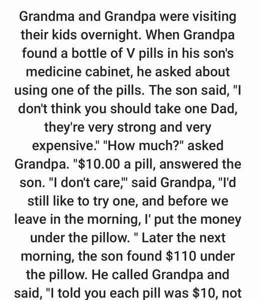Curious, Grandpa asked how much they cost. His son replied, “$10 per pill.” Unfazed, Grandpa said he didn’t mind and would leave the money under the pillow before they left the next morning.