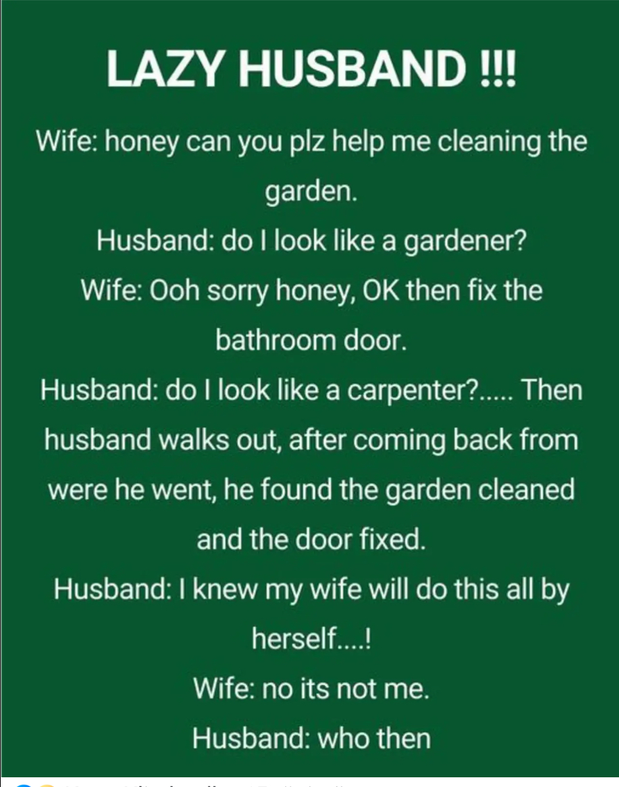 Then husband walks out, after coming back from were he went, he found the garden cleaned and the door fixed.