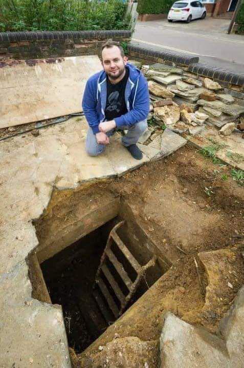Man discovers hidden WWII air raid shelter under his driveway. Simon Marks, 37, found it while trying to park his car and hearing strange noises. The cracked pavers revealed a piece of metal. He called his father, and they uncovered an old rusty ladder leading to the shelter.