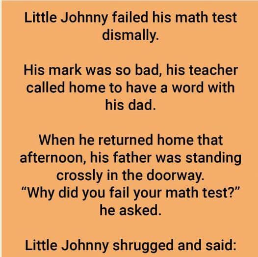 His grade was so terrible that his teacher called home to speak with his father. When he got home that afternoon, his father stood crossly at the doorway. “Why did you fail your math test?” he inquired. Little Johnny shrugged and replied: “My teacher isn’t very good.” Johnny’s father was astonished by his excuse and urged him to expand. “Well, on Monday, my teacher said 3+5 = 8.”