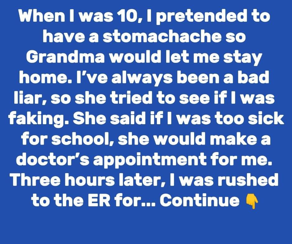When I was a kid, I pretended to have a stomachache so my grandma would let me stay home. I’m not a good liar, so she decided to test me. She said if I was too sick for school, she would make a doctor’s appointment. Three hours later, I was rushed to the ER for emergency surgery. My fake sickness turned out to be real—it was appendicitis, and it was so bad that if I hadn’t gone to the hospital that day, my appendix would have burst. I felt completely fine that day, so pretending to be sick actually saved my life.