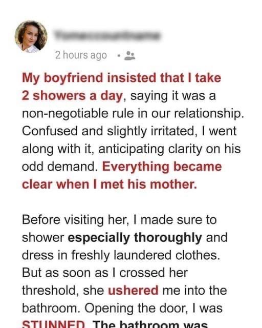 Her boyfriend was insistent that she took two showers every day and she didn’t have too much of a problem with it. When she met his mother, however, the relationship was over.