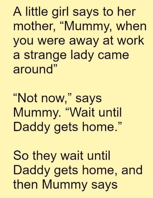 A little girl says to her mother: “Mummy, when you were away at work a strange lady came around”… “Not now,” says Mummy. “Wait until Daddy gets home.” So they wait until Daddy gets home, and then Mummy says “Now dear, what were you saying about Daddy and the strange lady?”