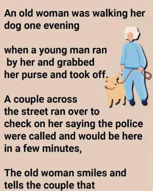 The old woman grins and tells the newlyweds this. She uses an old purse to hold her dog’s excrement until she can dispose of it at home.