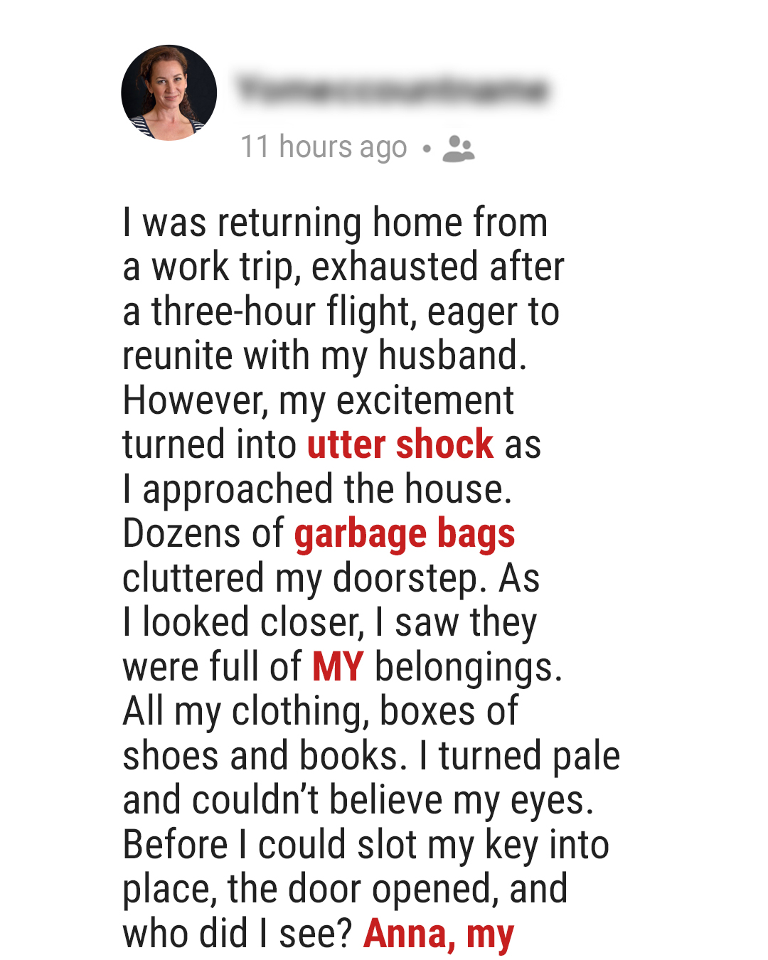 Suzi returns from her business trip to find her belongings sitting on the doorstep. She only wanted to shower and then get stuck into the kitchen, cooking for her husband. But he was at work when she arrived home, and her mother-in-law opened the door when she tried to get into her house. Why did she do it?You know how when you get off a three-hour flight — for work, not vacation — and all you want to do is go home, shower in your bathroom, and get into the comfiest pair of pajamas? So,