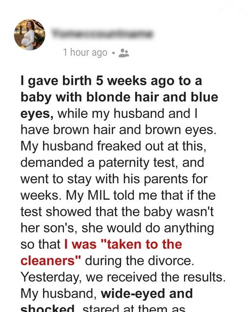 staying at his parents’ house and leaving me to cope alone with a newborn. His mother even threatened me if the baby wasn’t his.When the test results confirmed Sarah was his, Alex showed no remorse, accusing me of mocking his insecurity. I confronted him about his mother’s threats, and though he showed some regret, the damage seemed irreparable. A few days later, he returned, apologizing, but something still felt off.Driven by suspicion, I checked his phone and found messages revealing an affair with a colleague. His doubts weren’t about Sarah—they were a projection of his own guilt. I confronted him, and this final betrayal led me to tell him to leave. Though heartbroken, I found clarity. I needed to protect myself and Sarah, and with the support of those who truly cared, I was ready to move on.