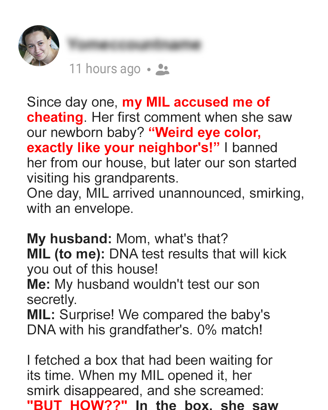 Then came the day that would turn everything on its head. My mother-in-law arrived unannounced, a smug look plastered across her face, clutching an envelope like it was the Holy Grail. My husband, caught off guard, asked, “What’s that, Mom?”She turned to me, her eyes gleaming maliciously, and declared, “DNA test results that will kick you out of this house, dear Liz!”I tried to keep my composure. “Oliver wouldn’t test our son secretly. What are you talking about?”With a flair for the dramatic, she announced, “Surprise! We compared the baby’s DNA with his grandfather’s. 0% match!”Refusing to let her theatrics corner me, I calmly retrieved a box from the corner of the room and placed it on the table in front of her. The moment she opened it, her smirk faded into disbelief, followed by a startled scream, “BUT HOW??”Inside the box were the results of our son’s DNA test, confirming his paternity, and a letter from the doctors explaining we had the test due to concerns about a genetic disease – fears that were thankfully unfounded.My MIL’s frustration was palpable. Not only did her plan fail, but a secret she had kept for years was suddenly laid bare. With tears in her eyes and no other choice, she turned to my husband and confessed, “I… I cheated on your father a long time ago, Oliver. He’s not your son’s biological grandfather. I was never sure, but this confirms it.”The air thickened with her confession. Oliver’s voice, calm yet firm, broke the silence. “You’ve deceived us for too long. I can’t be a part of your lies anymore. Liz and I were right to keep our distance from you.”At that moment, my husband, ever the embodiment of integrity, confronted his mother with the truth and told her he couldn’t keep her dirty secret from his father. Despite her tearful pleas, he stood his ground, prioritizing the values that defined our family.When we sat down with my husband’s father, the hurt in his eyes was heart-wrenching.”Dad, there’s something you need to know,” Oliver began, the words heavy with sorrow. The revelation shattered decades of trust, but in its wake, it also brought an unexpected healing.Though devastated, Oliver’s father faced the truth with a dignity that commanded respect. “I wish I had known sooner,” he said, his voice breaking, “but I’m grateful for your honesty, son.”The fallout was swift and decisive. “I deserve to live in truth,” declared my father-in-law, signing the divorce papers with a hand that trembled not from age but from the magnitude of the moment.”Andrew, please. Don’t do this. I’m sorry. Just give me a chance to…” My MIL’s desperate pleas fell on deaf ears.”You lied to me all this time, Jennifer. And as if that wasn’t enough, you concocted an evil plan to ruin your son’s marriage. How could you stoop so low? I can’t get past this. I can’t do this anymore.” Despite his firm response, I could see how broken my father-in-law was.What happened next was inevitable. My MIL’s house of cards crumbled. The family, once under her spell, saw her for who she really was. She lost much more than she had bargained for – her husband, her son, her grandson, and any respect we had for her.In the aftermath, as we navigated this new reality, our son found joy in the unexpected gift of having his grandfather move in with us.”Grandpa, are you going to stay with us now?” Nathan asked, his eyes wide with hope.”Yes, my boy, I’m here to stay,” replied Grandpa Andrew, his voice thick with emotion as he enveloped our son in a hug. It was a moment of new beginnings, of healing wounds and building bridges.My MIL has been pretty much out of the picture ever since. And as for us: we’re stronger than ever, a family built not on secrets, but on trust, love, and a whole lot of drama that I never signed up for but somehow survived.So, that’s my wild ride. Thanks for letting me share. It’s been cathartic, to say the least.How would you handle the situation if you were in my shoes?While you’re thinking about the answer, here’s another story you might like: Isabella thought she understood the meaning of sacrifice and loyalty until a single photograph revealed a web of deceit that unraveled her family. What did that photo hold?