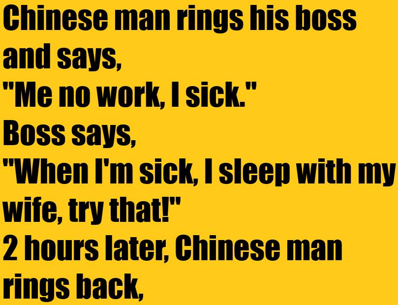 A Chinese employee calls his boss and says, “I can’t work today, I’m sick.”