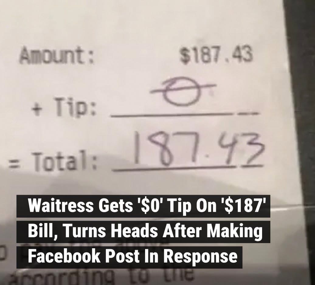 When Taylar Cordova received a tip for $0 on a bill of $187.43, she took a picture of the receipt and posted it to Facebook, reports Mic. Her post was accompanied by a passionate and articulate commentary about working as a server.