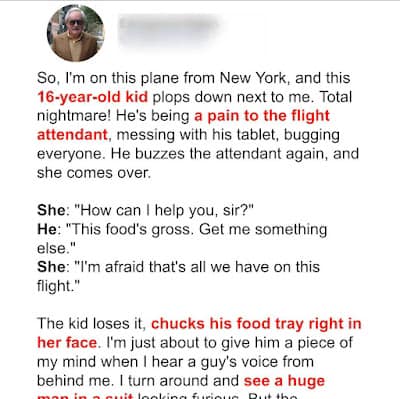 17-year-old Andrew, a spoiled rich kid accustomed to having his way, often mistreats others. After seeing him mock a flight attendant, his father decides it’s time Andrew learns a lesson in respect.“Can you move it faster?” Andrew grumbled impatiently as he maneuvered past an older man being assisted by a young flight attendant. The man had trouble walking, but Andrew didn’t think twice before mocking him and rushed to his seat.As the plane took off, Andrew, a frequent flyer since childhood, lifted the window shade, feeling bored and eager to return home after his first semester at boarding school. He eventually rose to retrieve his tablet but left his bag protruding from the overhead bin…The flight attendant who’d been assisting the older man earlier approached him. “Your bag is popping out. You didn’t close the overhead bin properly, sir.”