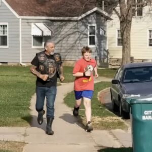 For three months, I watched from my kitchen window as a stranger in a leather vest jogged beside my thirteen-year-old son, Connor, every morning at exactly 6…