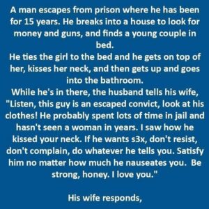 The wife calmly replies, “He wasn’t kissing my neck. He was whispering in my ear. He told me he’s gay, said he thought you were cute, and…